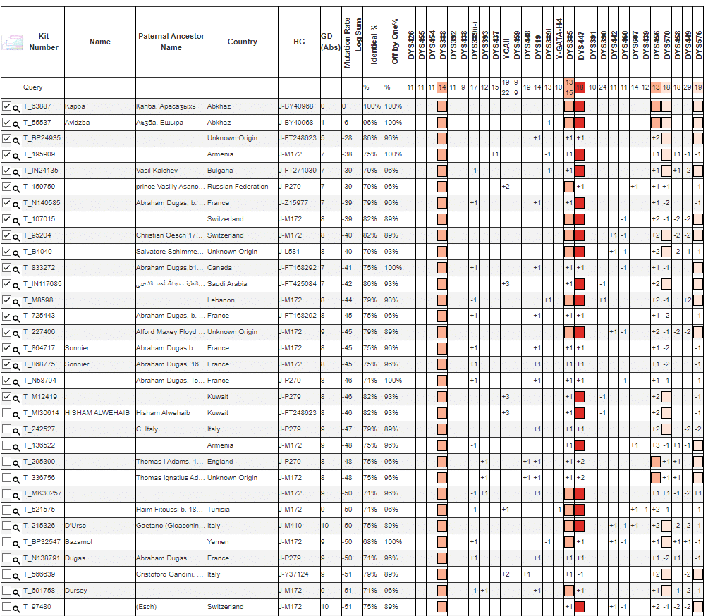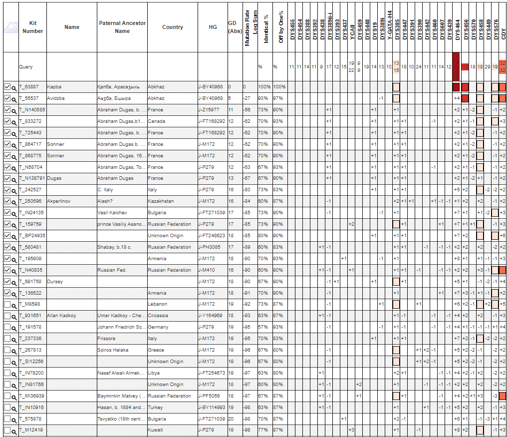 По результатам теста выявлено относительно близкое родство с Авидзба из с. Эшера, других потенциально близких образцов нет.
