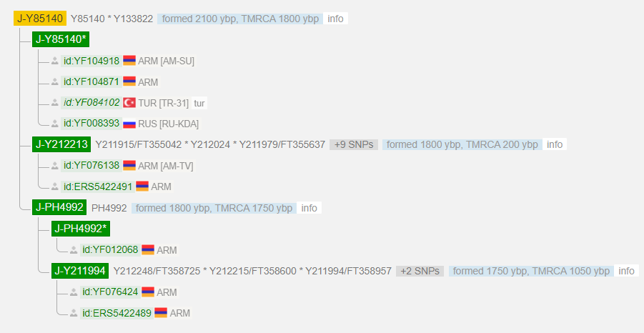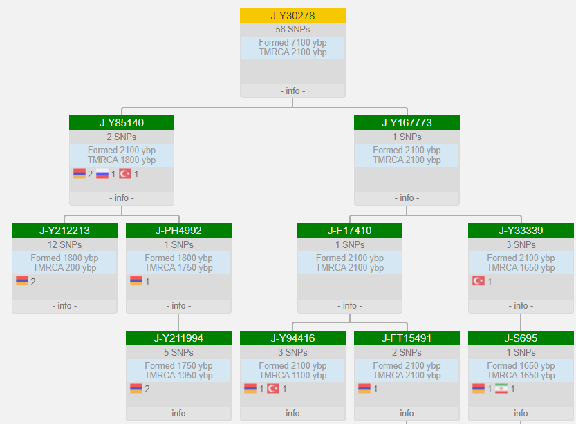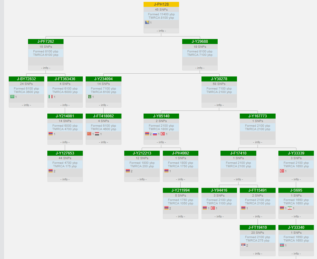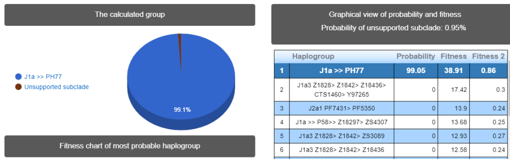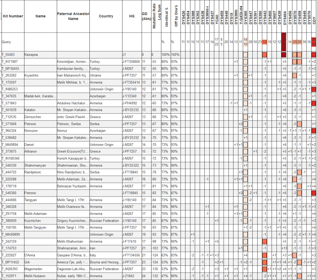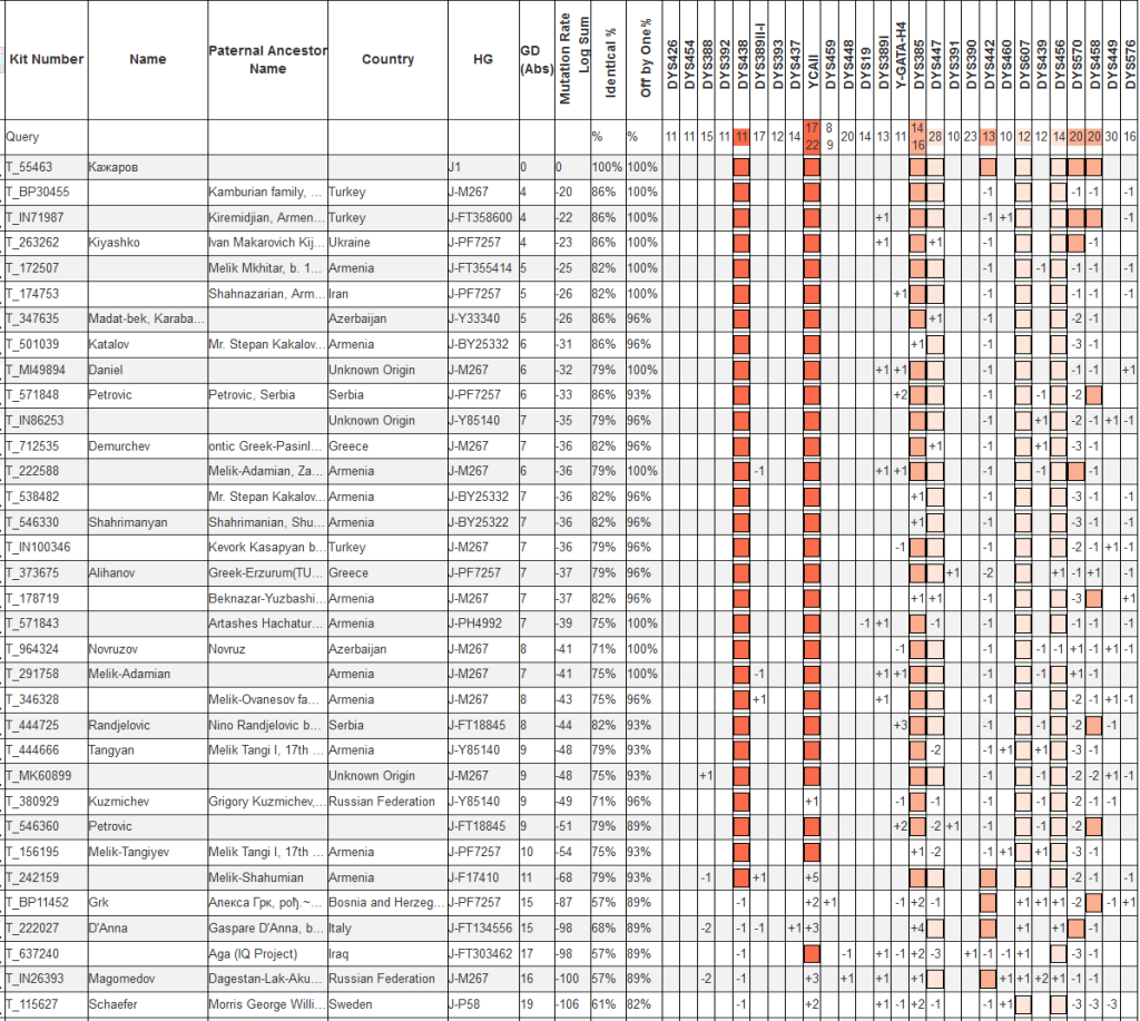 Выявленная в ходе теста линия гаплогруппы J1 относится к очень редким. Наиболее часто встречается эта ветка у армян. Ареал распространения Южный Кавказ, Иран и Турция. Дистанция до более распространенных линий J1 огромная, более 10 тыс. лет.