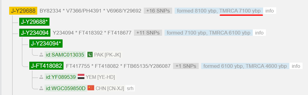 Дистанция до последнего общего предка ~ 7100 лет. Здесь мы видим образцы из Пакистана, Йемена и Китая. Правда все они далеки от линии Кажарова (~ 7100 лет).