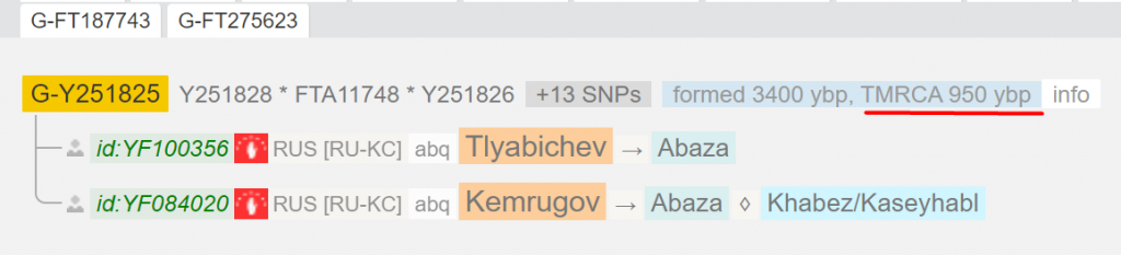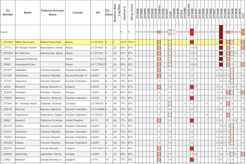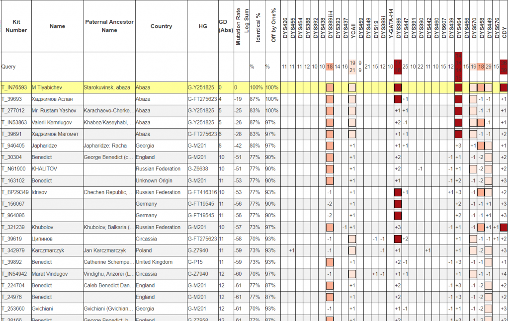 Маркерные совпадения не такие надежные, но они позволяют использовать более расширенную базу совпадений. Для примера у Яшева и Хаджимовых нет глубоких тестов. У них только 37 маркерные тесты. С большой степенью надежности сложно определить, будут ли кто-то из них ближе к Кемрюгову или Тлябичеву. Однако вероятнее всего все эти 4 фамилии относительно имеет относительно недавнего общего предка.