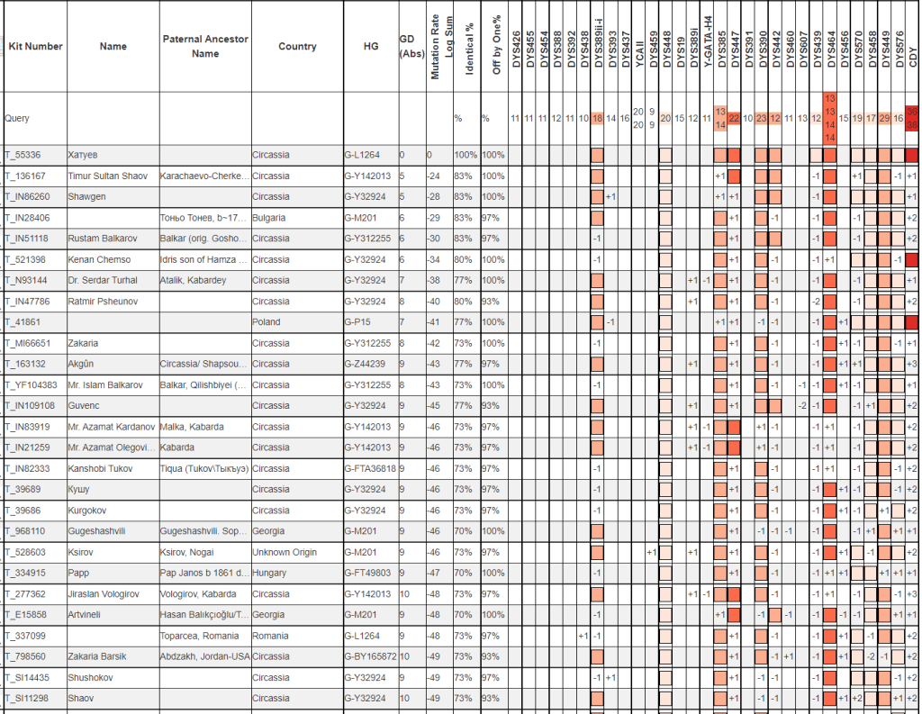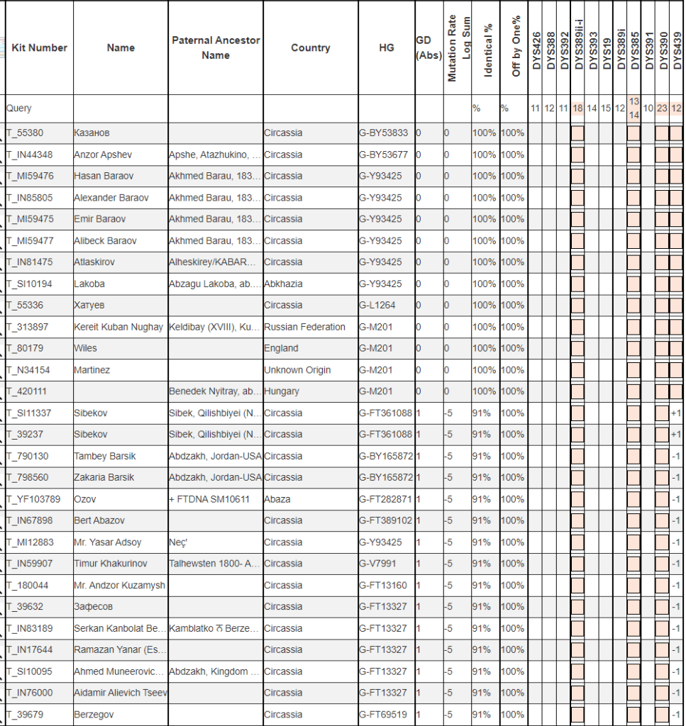 По результатам 37 маркерного ДНК теста Y-хромосомы выявлена самая распространенная у адыгов ветка. Эта древняя линия с глубокими корнями, преимущественно на западном Кавказе. Потенциально близких совпадений с другими протестированными фамилиями не выявлено.