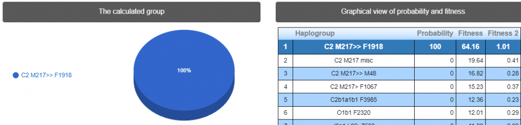 Выявлена гаплогруппа C2. Наиболее вероятные субклад Y4464 >> Y4541