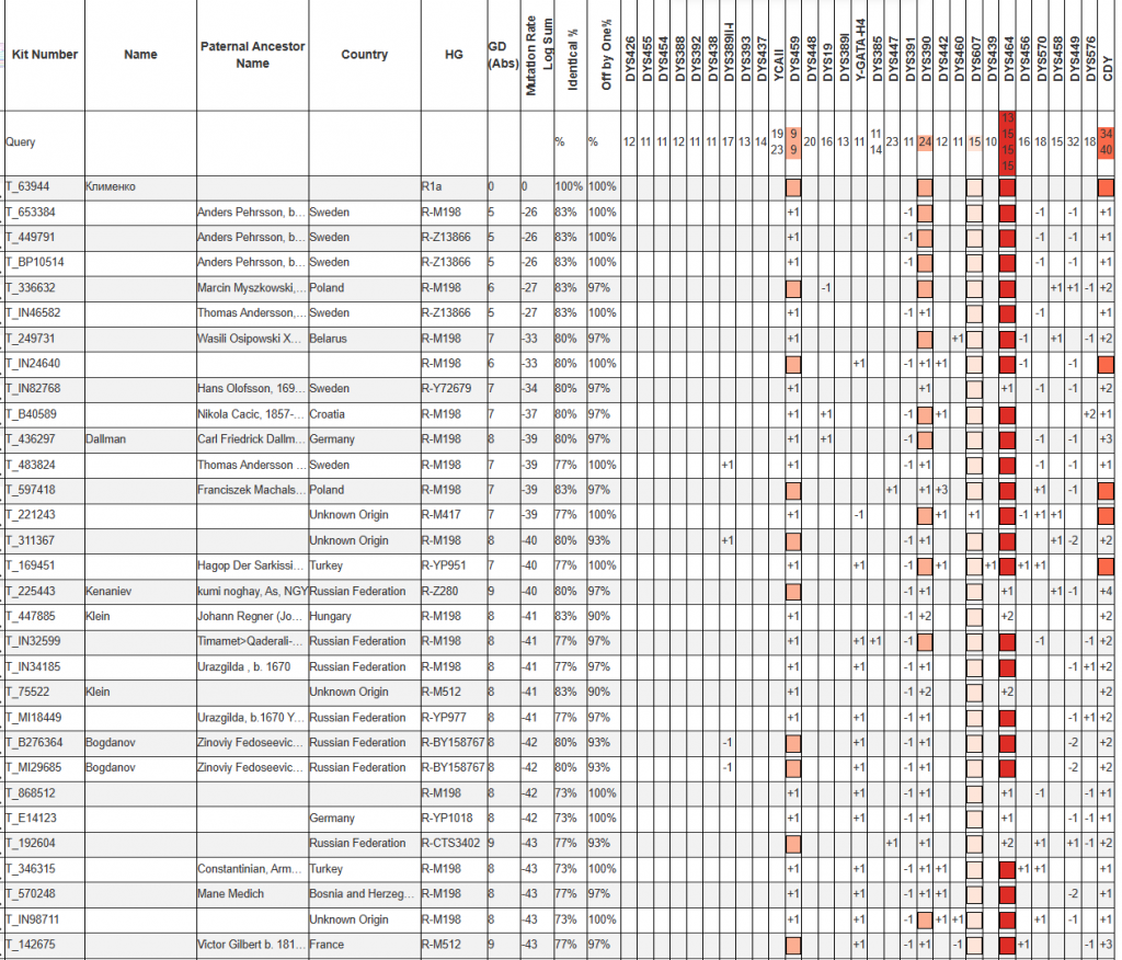 Здесь надо в первую очередь обращать внимание на колонку GD. Чем меньше там цифра, тем более близкий результат (совпадают маркеры). В таблице отмечены отличающиеся маркеры. GD = 5 может означать как родство на уровне 3х тыс. лет, так и до 1000 лет.