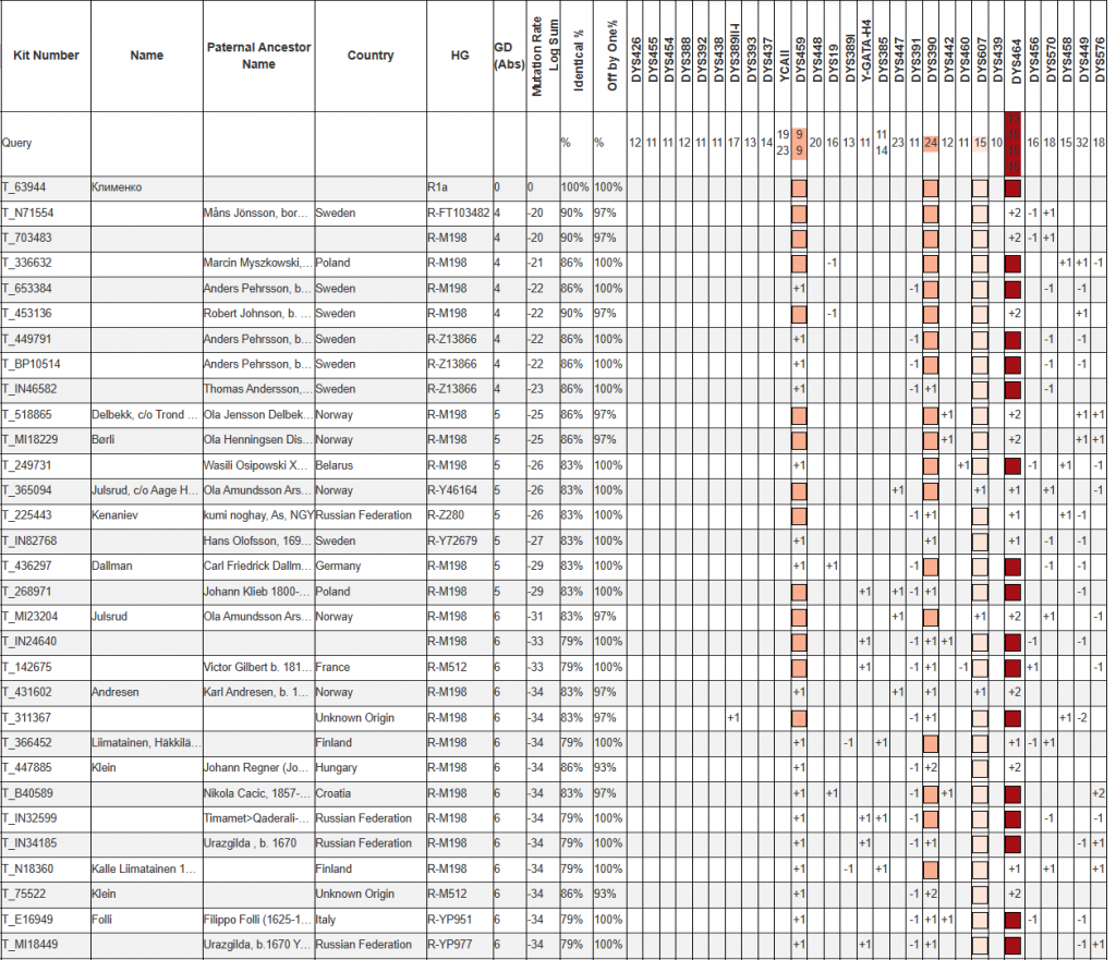 К сожалению по 37 маркерам определить из каких отмеченных цветами регионами могли быть предки Клименко невозможно. Если резюмировать, то можно сказать, что результаты Клименко относятся к одной из самых распространенных у славян линий.
