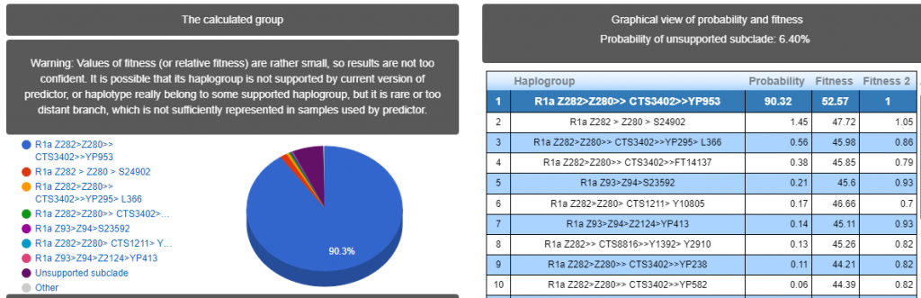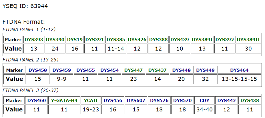 Исследовано 37 маркеров в немецкой лаборатории YSEQ. В отличий от гораздо более дорого полногеномного теста, 37 маркерный тест позволяет только предсказать относительно глубокие линии гаплогрупп.