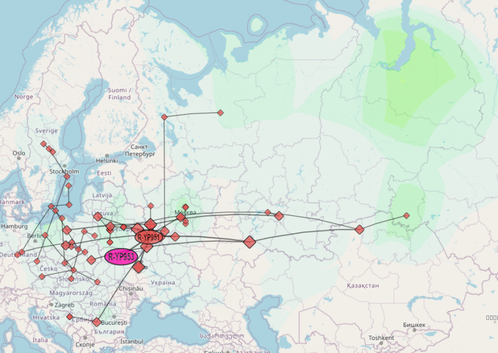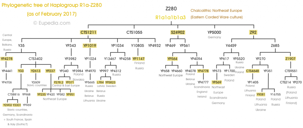 Все потомственные линии Z283 описать почти невозможно, мы состредочимся на той, что выявлена у Клименко. Самый глубокий прогнозируемый субклад (ветка на древе) — YP953.