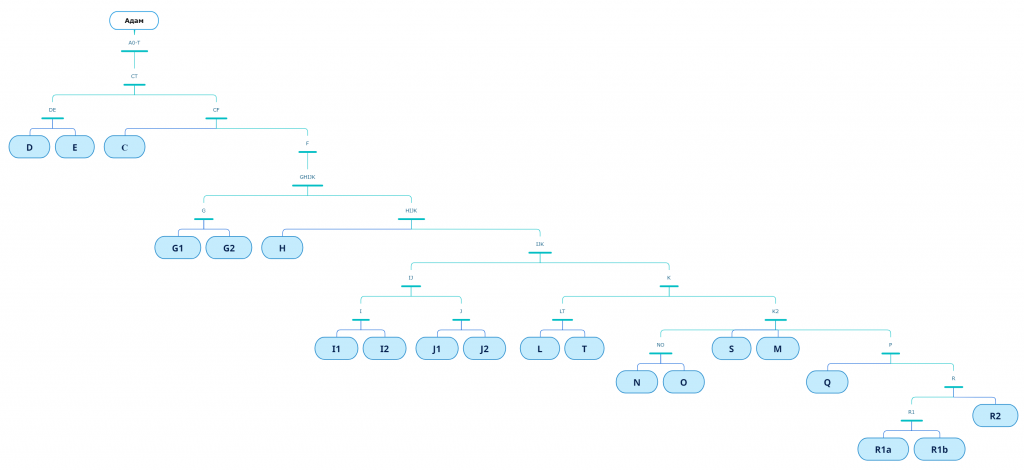 Все мужчины произошли от одного предка который жил более 200 тыс. лет назад. Цифра расчетная. Этого общего предка назвали оригинальным именем Адам. Он находится у основании Y-древа. В дальнейшем на Y-древе образовались много стволов. Это разные линии мужчин. Каждый из этих стволов можно получил свое номенклатурное название от A а до T.