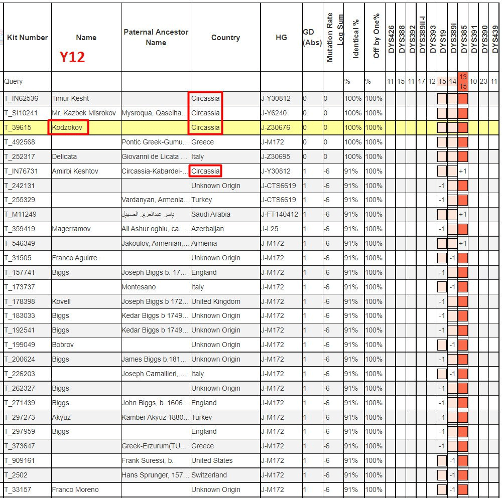 На 12 маркерах Кодзоков полностью совпал с Кештовым и Мисроковым.