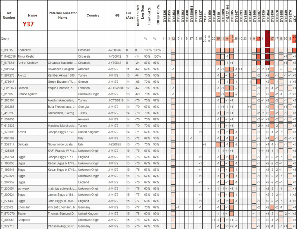Кодзоковы из Дыгулыбгъуей (протестированы двое) и из Турции (Uzunyayla) показали близкий результат, J2a — Z387 (между ними ~275 лет). А вот дистанция между Кодзоковым из Терекского и Кодзоковыми из Дыгулыбгьуей и Турции +- 16 тыс. лет.