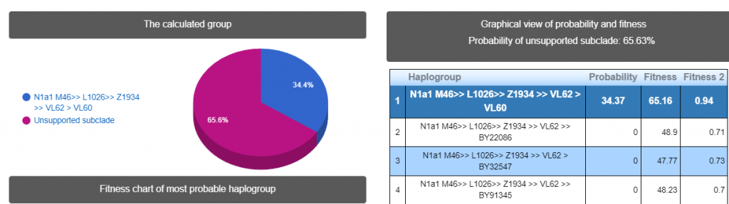 Выявлена гаплогруппа N. Наиболее вероятные субклад VL62.