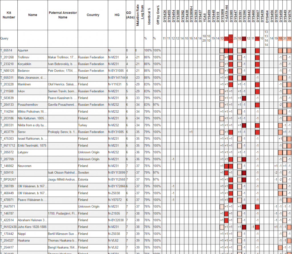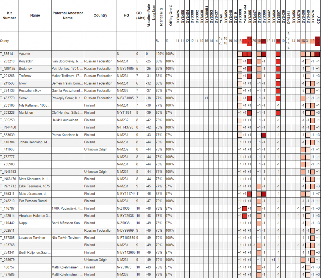 Поиск STR-совпадений в базе STR Match Finder помогает найти потенциальных родственников по мужской линии среди других протестированных из той же популяции. Мерой близости при этом служит генетическая дистанция, зависящая от числа мутационных различий