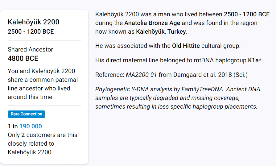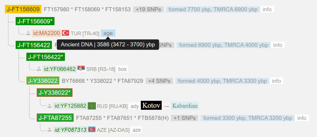 В субкладе FT156422 кроме тех кого мы описали выше представлен современный образец из Боснии и древний хетт. Этот хетт жил в Анатолии ~3500 лет назад. Отметим, что кроме ветки Котова днк хеттов выявлено только в распространенной у понтийских греков ветке G2a2 M406. Е
