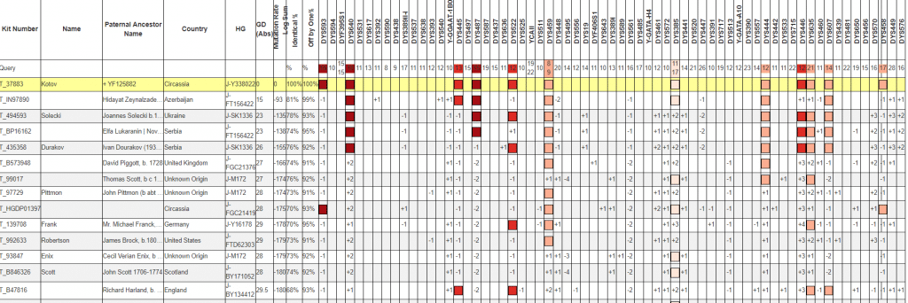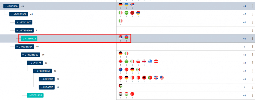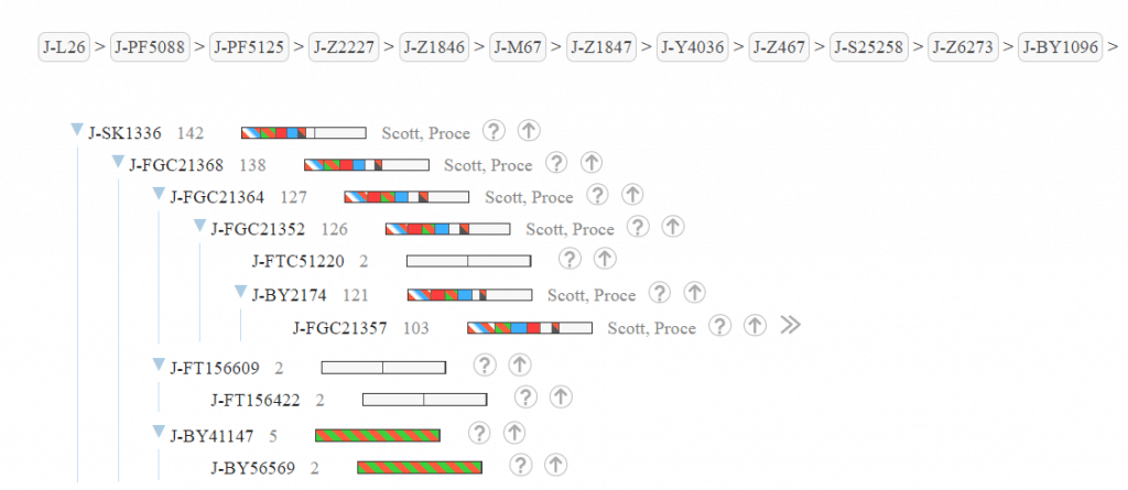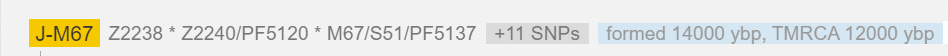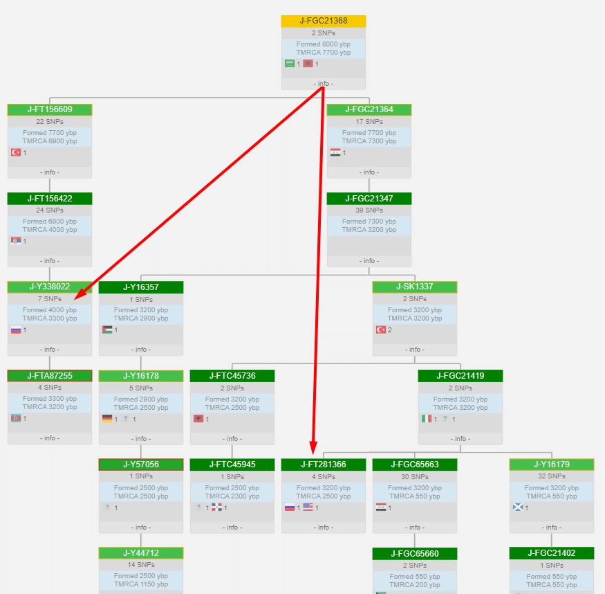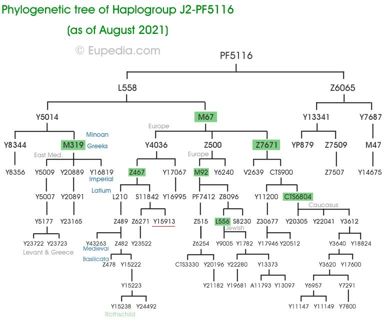 Субклад M67, к которому принадлежит образец, является одной из крупнейших ветвей J2a. Он разделяется на множество линий, часть из которых распространена на Кавказе. На картинке ниже отмечен субклад Y15913 (альтернативное название SK1336), в который попадает результат Котовых.