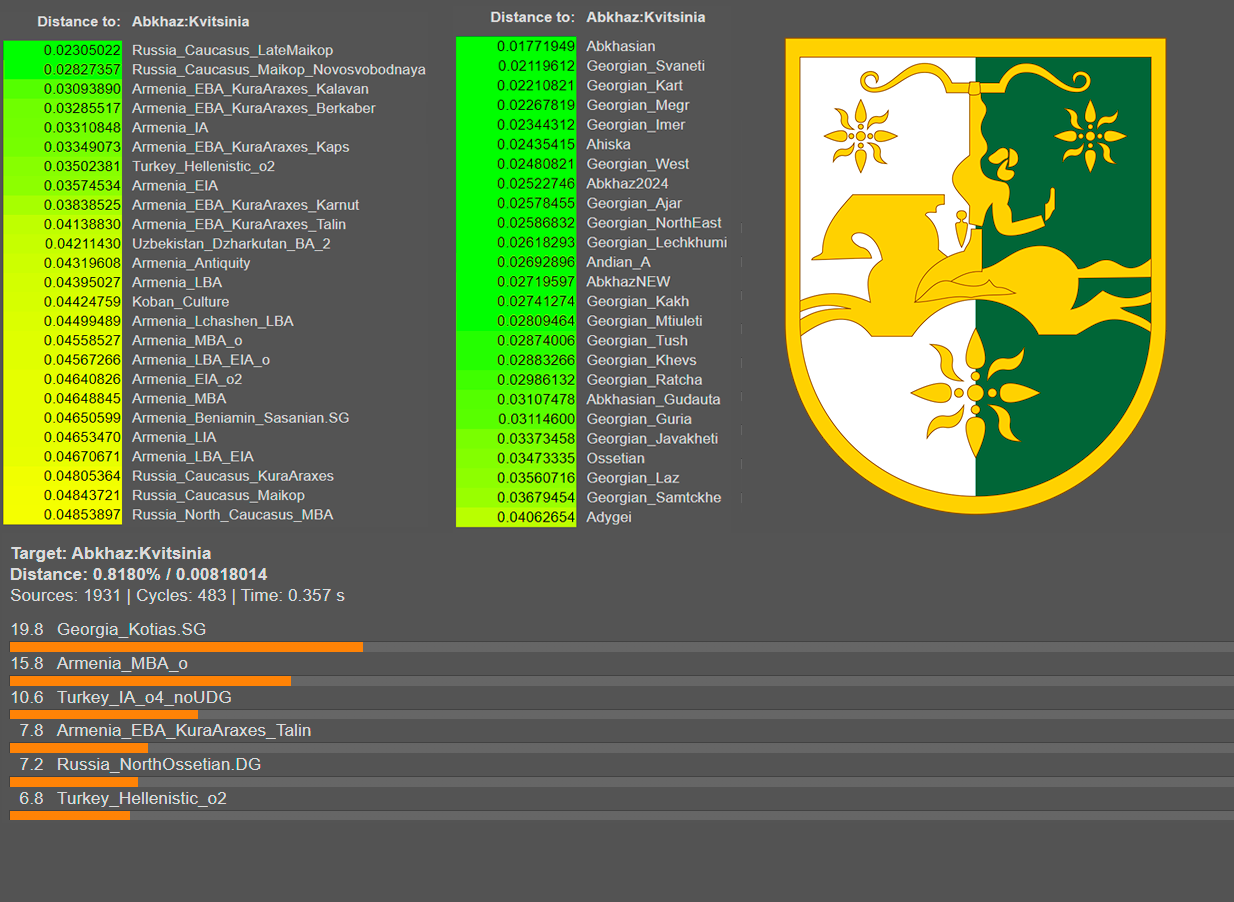 Квициния в рамках ветви (TMRCA 1700 лет) группируется с рядом карачаевских родов, а также с абхазами Джинджал и Харазия. Также стоит добавить то, что тестами охвачено свыше 10 представителей этого рода и все они оказались однородными.