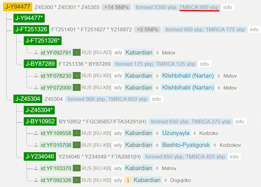На древе Yfull есть несколько веток, которые состоят исключительной из кабардинцев с общим возрастом жизни общего предка в районе 900 — 1100 лет. Важно также, чтобы количество протестированных было больше чем 2-3.