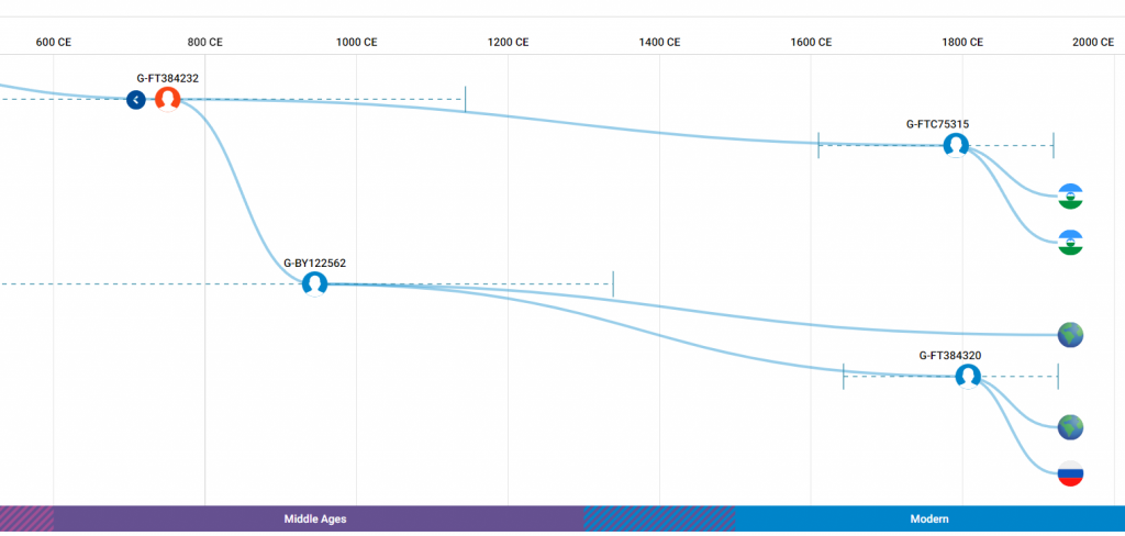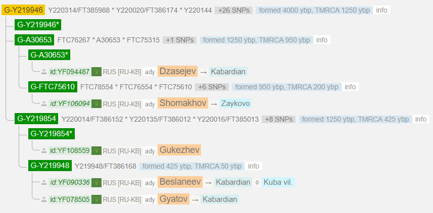 Общий предок Y219946 жил около 1250 лет назад. Дистанция до предшествовавшей ветки FT9681 огромная, 3000 лет. Т.е. предки Y219946 где-то были 3000 лет, не оставили ни с кем связей и 1000 лет назад они появляются в Кабарде. Все протестированные кабардинцы, причем все кроме Гукежева из Зольского района.