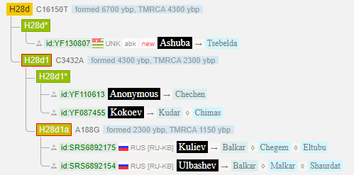 Из Абхазо-Адыгов в данную ветвь попадают Адыги: Болотоков и Тохтамышев, Ашхарский (Башилбай) абазин Aза (Ӷыӡа) и собственно Абхаз Лабахуа.