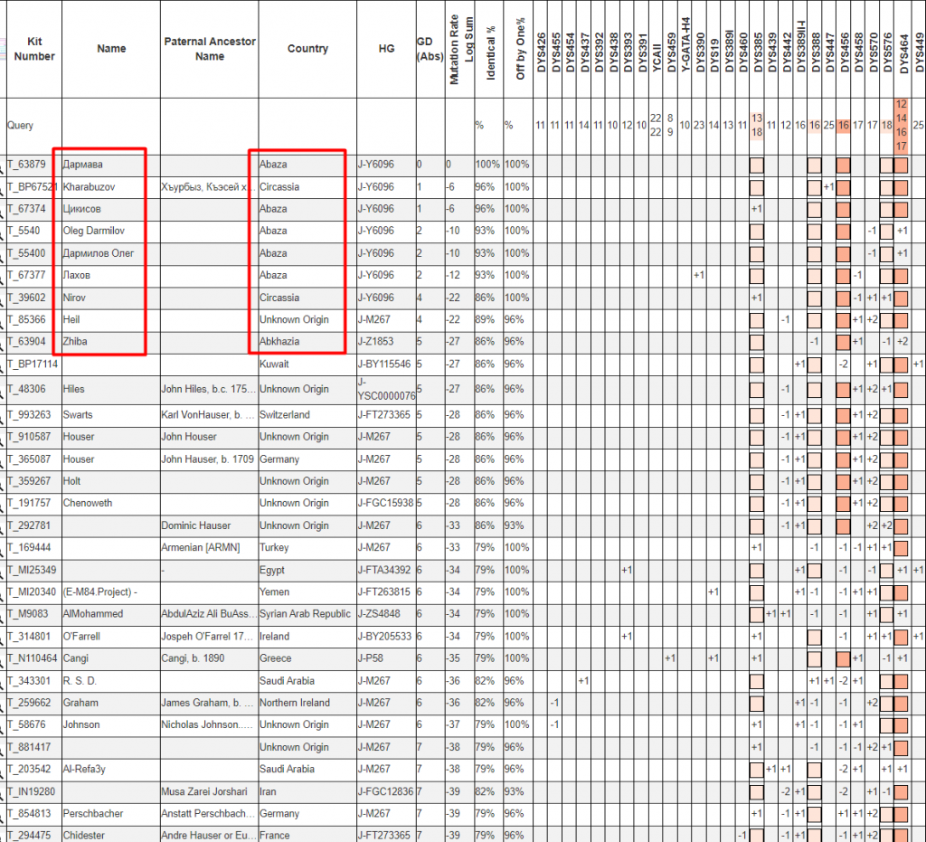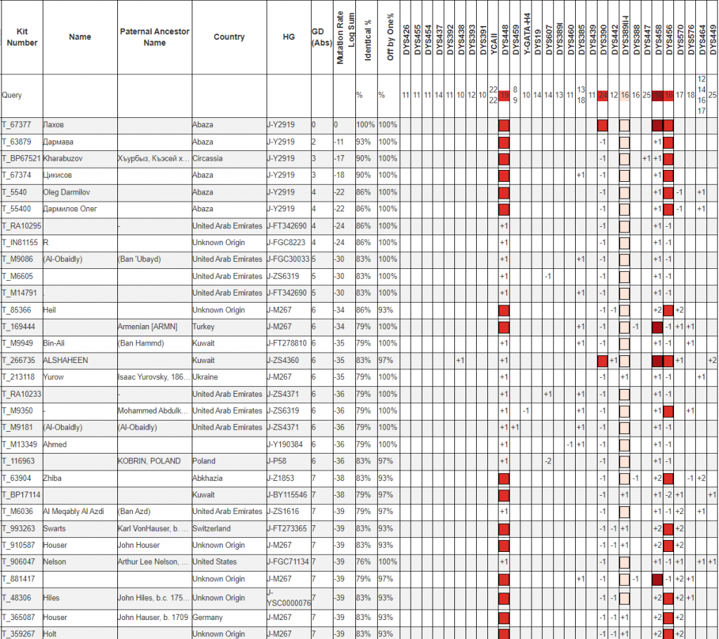 Иногда мы обнаруживаем единичные результаты и не может ни с кем связать. Проходит время и появляются новые тесты и картина совсем меняется. Ветка в которую попал Цикисов за последние месяцы превратилась в самую мощную линию у абхазо-адыгов. В нее попадают абазины ашхарцы Дармилов (одна из линий), Цикисов, Лахов, кабардинцы Ныров и Харабузов и абхаз Ажиба. Так же туда же скорее всего попадут 12 маркерные тесты кабардинца Бижева и абазина Озова (одна из линий).