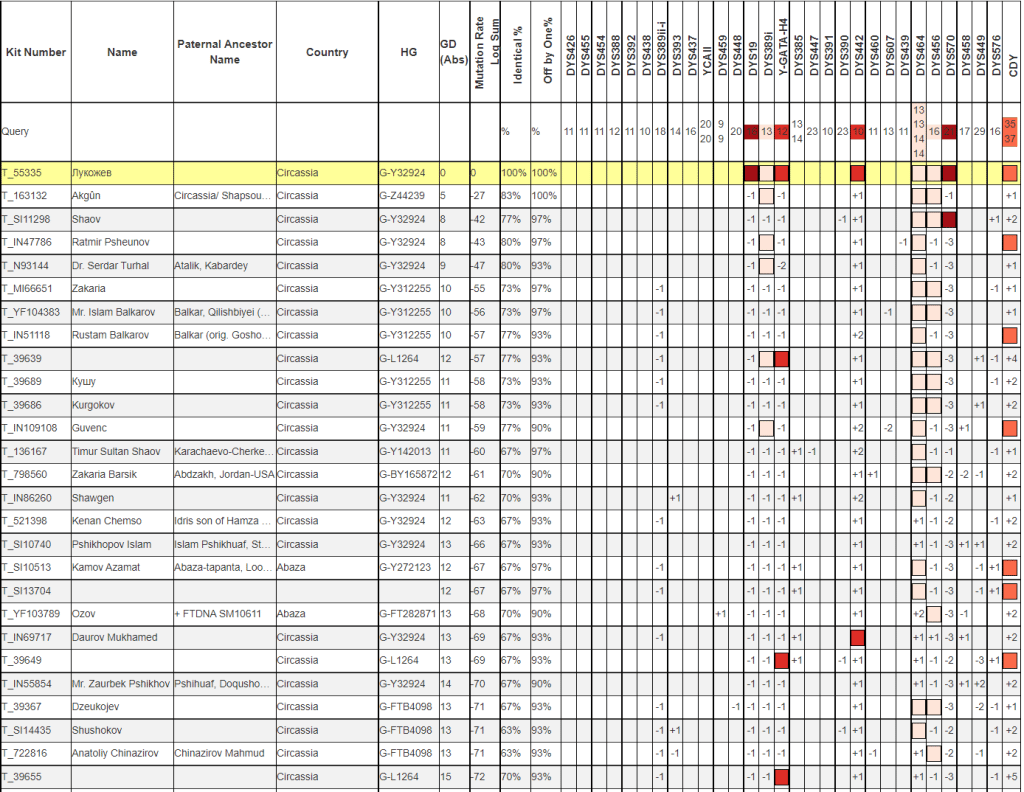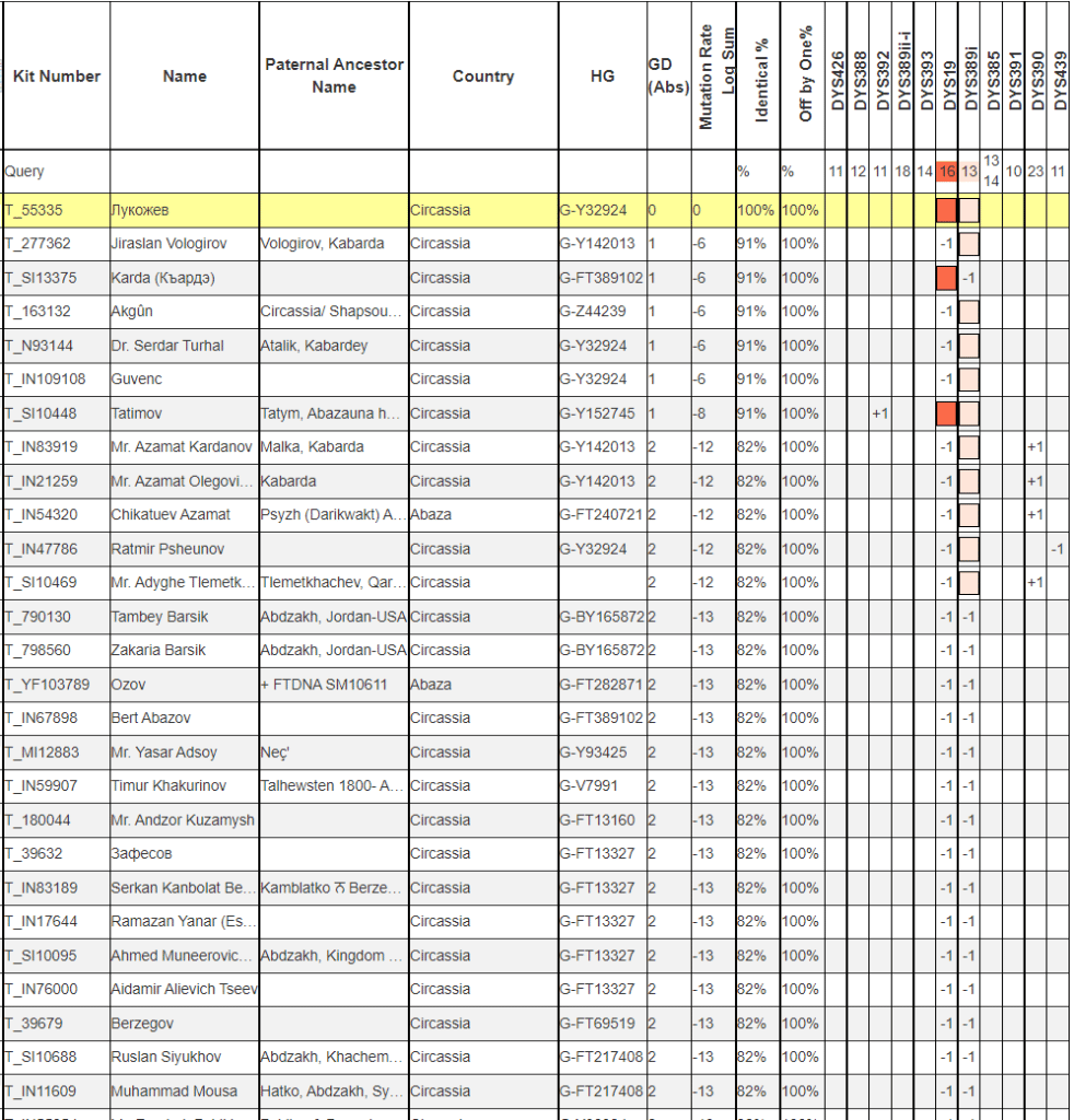По результатам 37 маркерного ДНК теста Y-хромосомы выявлена самая распространенная у адыгов ветка. Эта древняя линия с глубокими корнями, преимущественно на западном Кавказе. Потенциально близких совпадений с другими протестированными фамилиями не выявлено.
