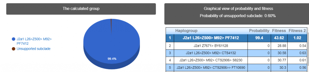 Выявлена гаплогруппа J2a. Наиболее вероятный субклад M92 >> PF7412 > Z515
