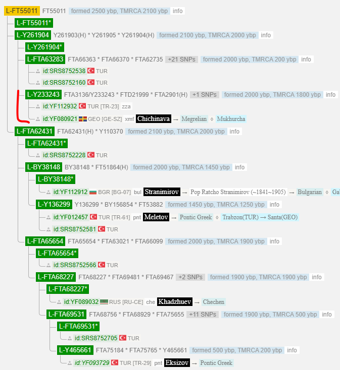 Сделано Y37 маркеров в YSEQ, выявлена гаплогруппа L1b, субклад FT55011