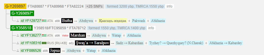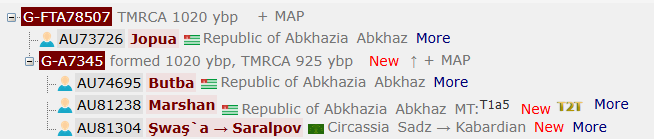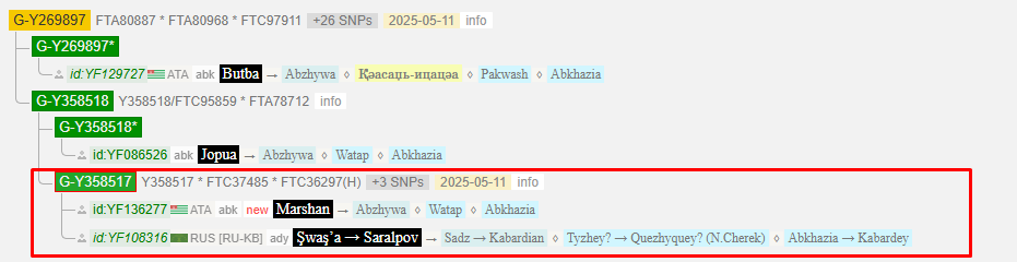 После обновления древа Yfull Маршан образовал новую ветвь с Саральповым. Общий предок Саральпова и Маршана жил 800 лет тому назад (1200-й год). Согласно семейной легенде род Саральповых происходит из местечка между Адлером и Сочи. В прошлом носили фамилию Шәаша. На сегодняшний день род Шәаша встречается в ряде Садзских сёл Турции. Также в данную ветвь попадает Абхаз Хватыш. Потенциально в неё может попасть ряд абазинских родов: Балов, Сидов, Растов.