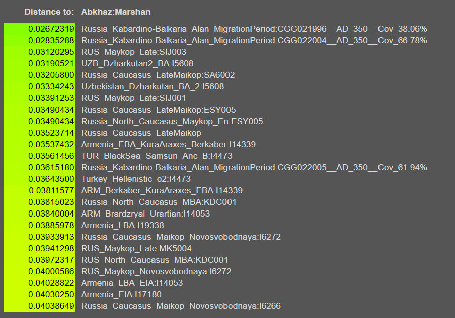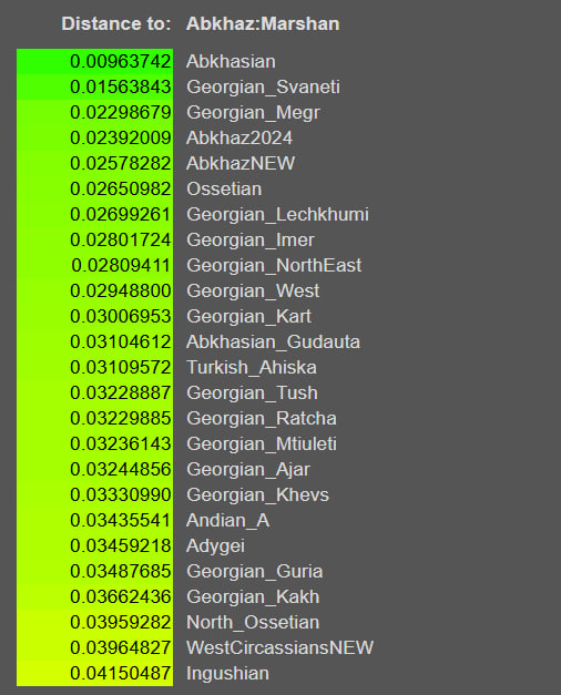 Маршан попал в общую ветвь с Абхазами Бутба, Джопуа и Кабардинцем Саральповым. Общий предок четырёх родов жил 1550 лет тому назад.