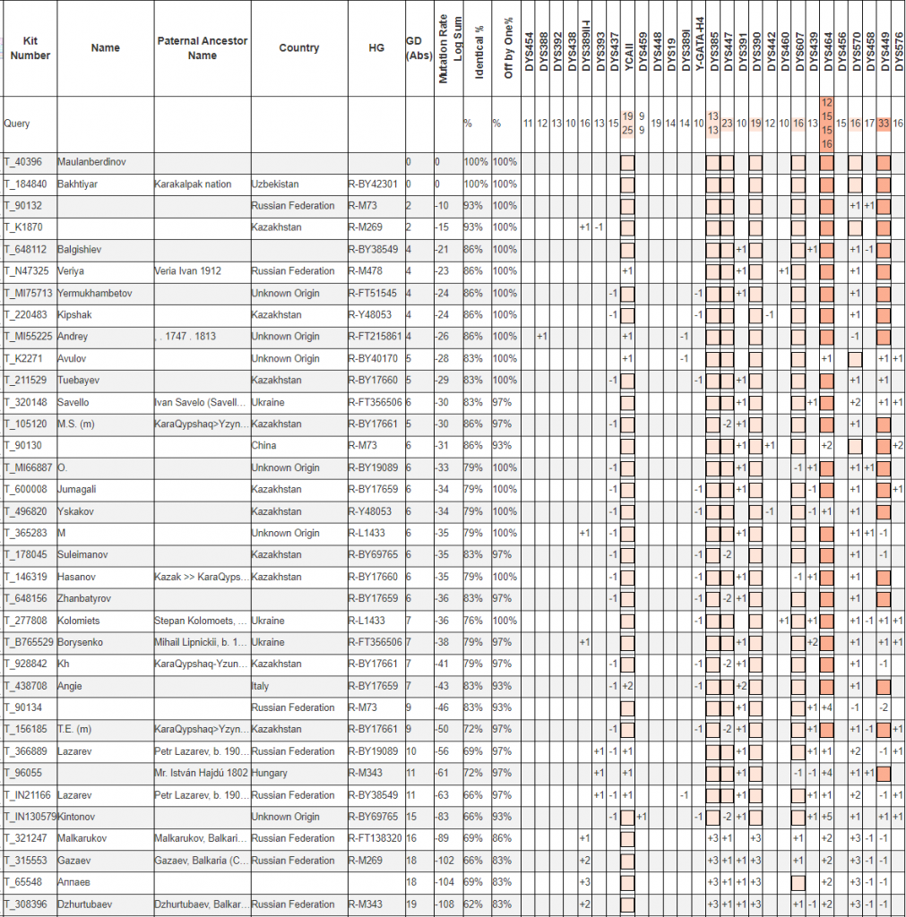 Поиск STR-совпадений в базе STR Match Finder помогает найти потенциальных родственников по мужской линии среди других протестированных из той же популяции. Мерой близости при этом служит генетическая дистанция, зависящая от числа мутационных различий