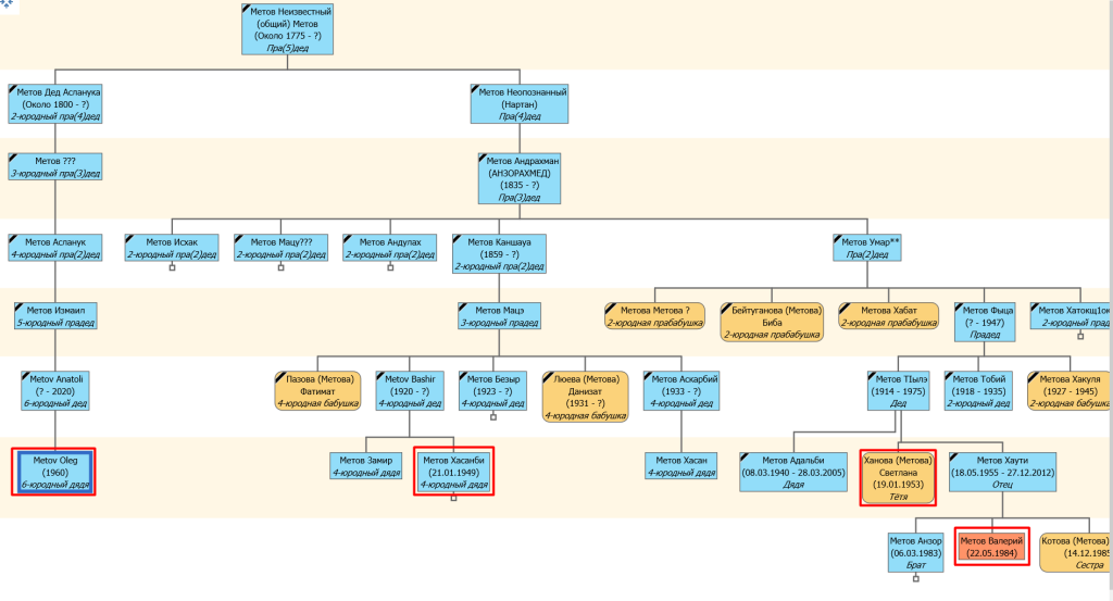 Протестировано 3 представителя фамилии. Подтверждено единое происхождение Метовых из а. Ходзь (Адыгея) и Нартана (Клишбиево, Кабарда). Благодаря 3 глубоким тестам удалось рассчитать время до ближайших общих предков. У Метовых из Кабарды 125 лет был общий предок. С Метовым из а. Ходзь они +- на 50 лет дальше.
