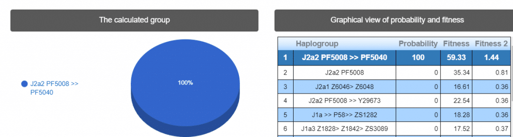 Выявлена гаплогруппа J2a. Наиболее вероятный субклад >> L581 >> PH1795 >> Y152278.