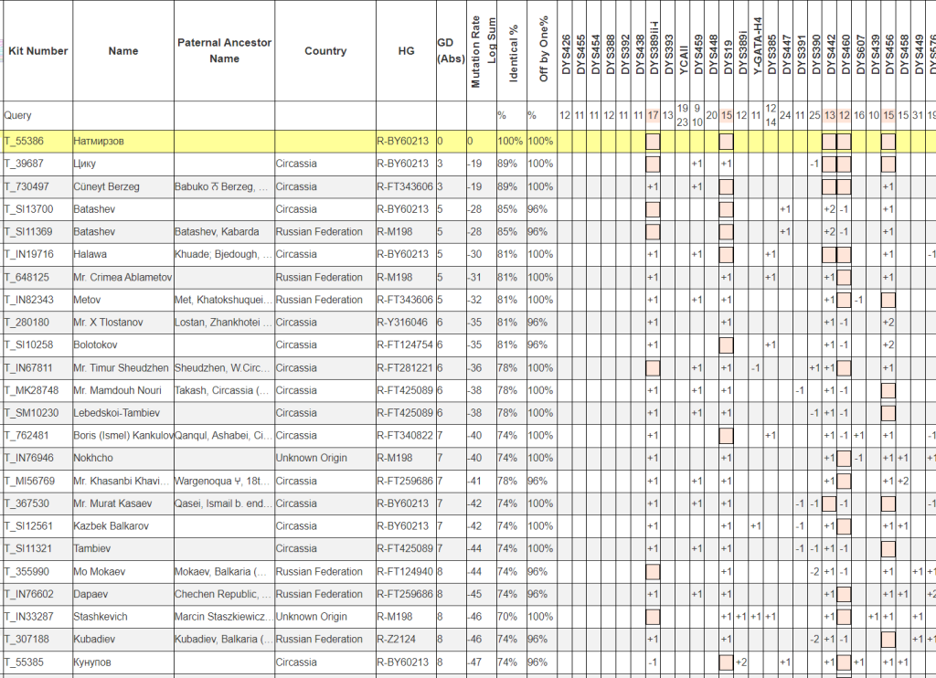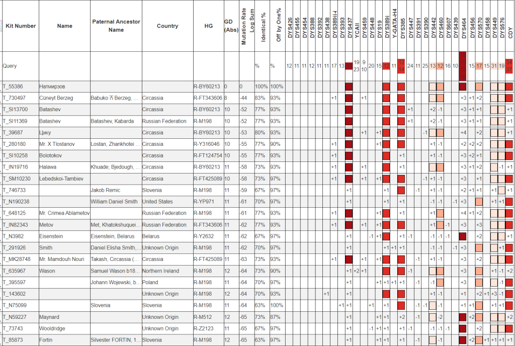 Ключевой маркер этой ветки — DYS437 = 13. На следующем скриншоте сравнение только по тем у кого этот маркер равен 13. Дополнительно из сравнения убраны DYS570, DYS464 и CDY, которые искажают картину.