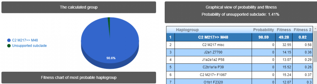 Выявлена гаплогруппа C2. Наиболее вероятные субклад M48  >> Y12825