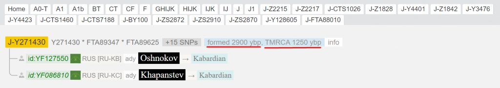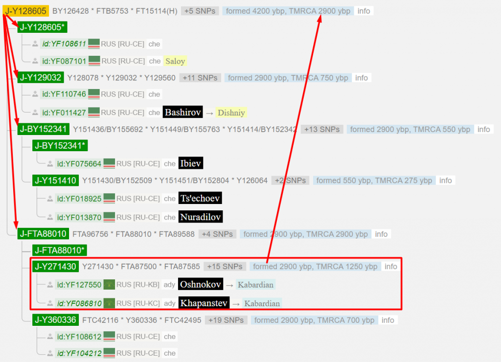 Конкретные название веток на древе не так важны. В Y271430 кроме Ошнокова попадает Хапанцев. Как выше было обозначено, у этих кабардинских родов был один общий предок чуть больше 1000 лет назад. Если вернемся на 1 уровень назад, то на дистанции 2900 лет чеченские результаты.