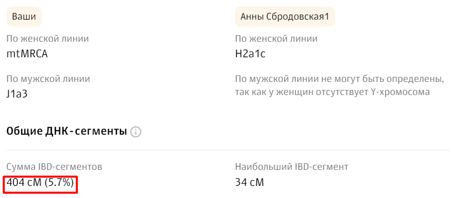 Т.е. общее родство с Анной на уровне до 3-4 поколений. Такое встречается очень редко. Обычно в рамках аутосомных тестов встречаются совпадения до 100 сМ.