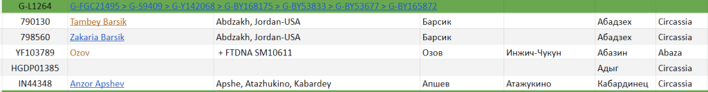 Абадзех Барсик и неизвестный научный образец из Адыгеи. Примерно на такой же дистанции, скорее всего, будет Апшев, Кабардинец из Атажукино. У него Y111 тест.