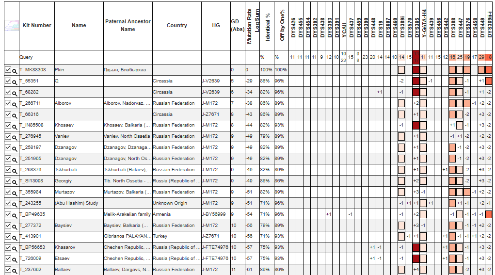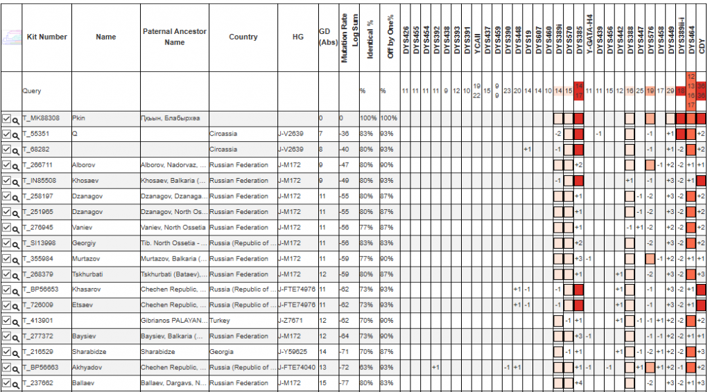 Очевидно наиболее близкими к Пкин окажутся два анонимных черкесских результата, а также ряд других географически близких результатов (осетины Алборовы, Ваниевы, Дзанаговы, Цхурбаевы, Георгиевы; а также балкарцы Хосаевы, Муртазовы, Байсиевы). Все вышеперечисленные после апгрейда создадут свою отдельную ветвь.