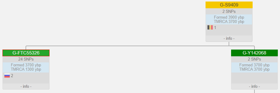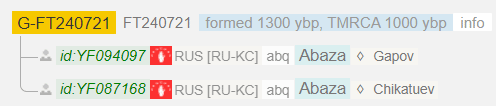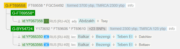 В левой части Y142068 > FT69558. Возраст до общего предка 2300 лет.