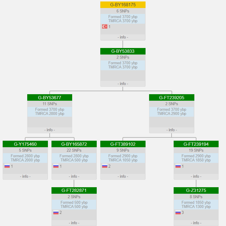 Y142068 > BY168175. На схеме ниже видно, что BY168175 имеет гораздо более сложную структуру. На самом верху безымянный представитель Турции. Возможно мухаджир. Далее идет разделение на 2 линии. BY53677 и FT239205