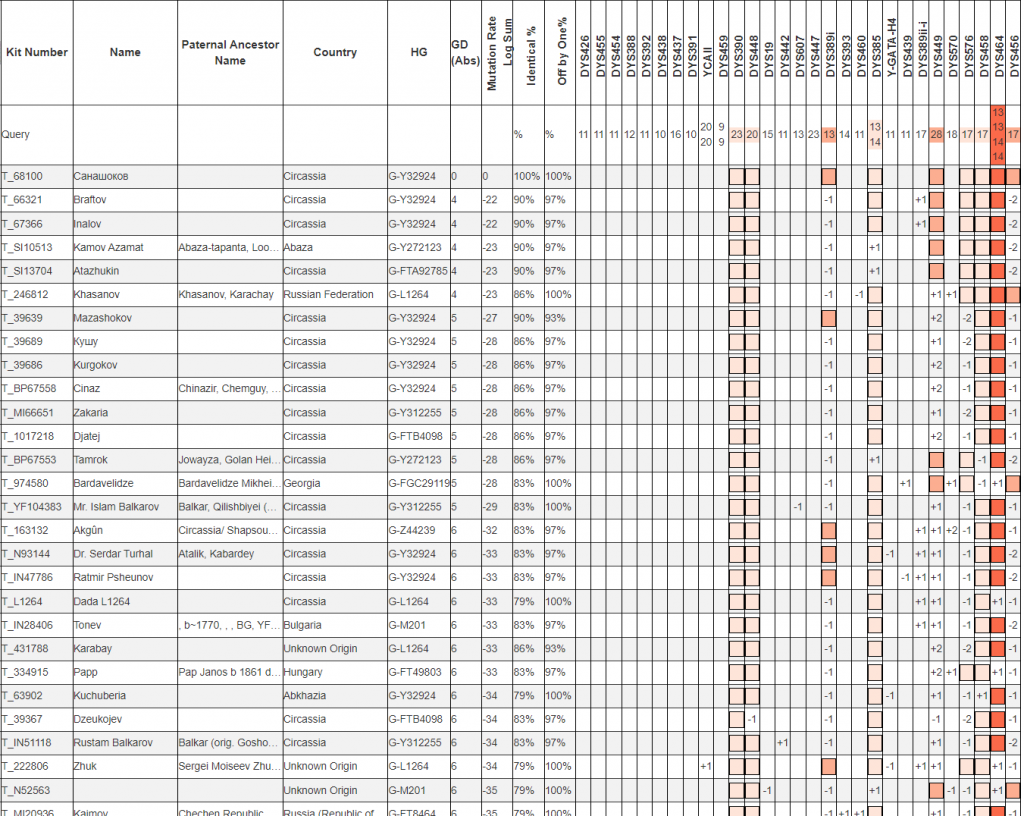 По результатам теста выявлена самая распространенная у адыгов линия G2a2 L1264. За тысячи лет потомки прародителя этого субклада разделились на множество ветвей. Истоки всех эти субкладов идут к древним земледельцам появившимся на Кавказе 7-10 тыс. лет назад.