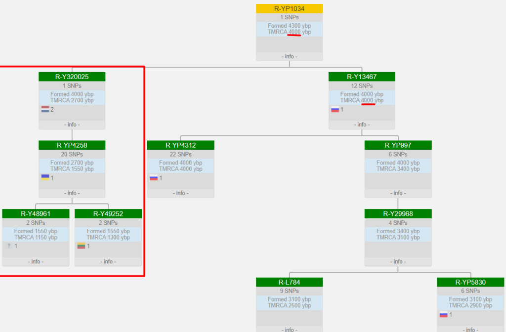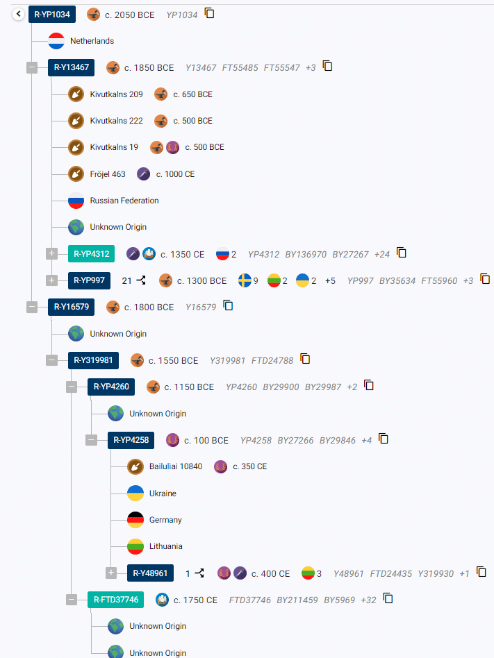Древо YP1034 на Yfull. Вероятнее всего Сатучиев попадет в левую часть. Там заметно меньше результатов чем в правой.
