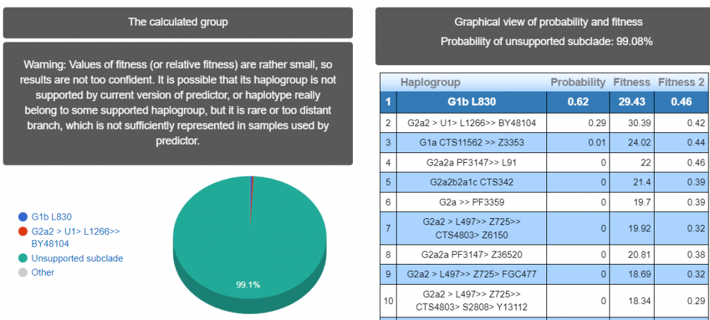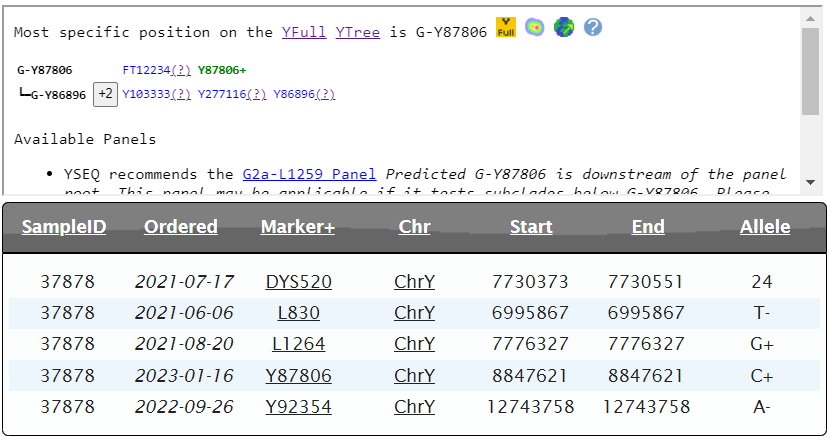 Выявлена гаплогруппа G2a2. Подтвержденный субклад L1264 >> Y87806