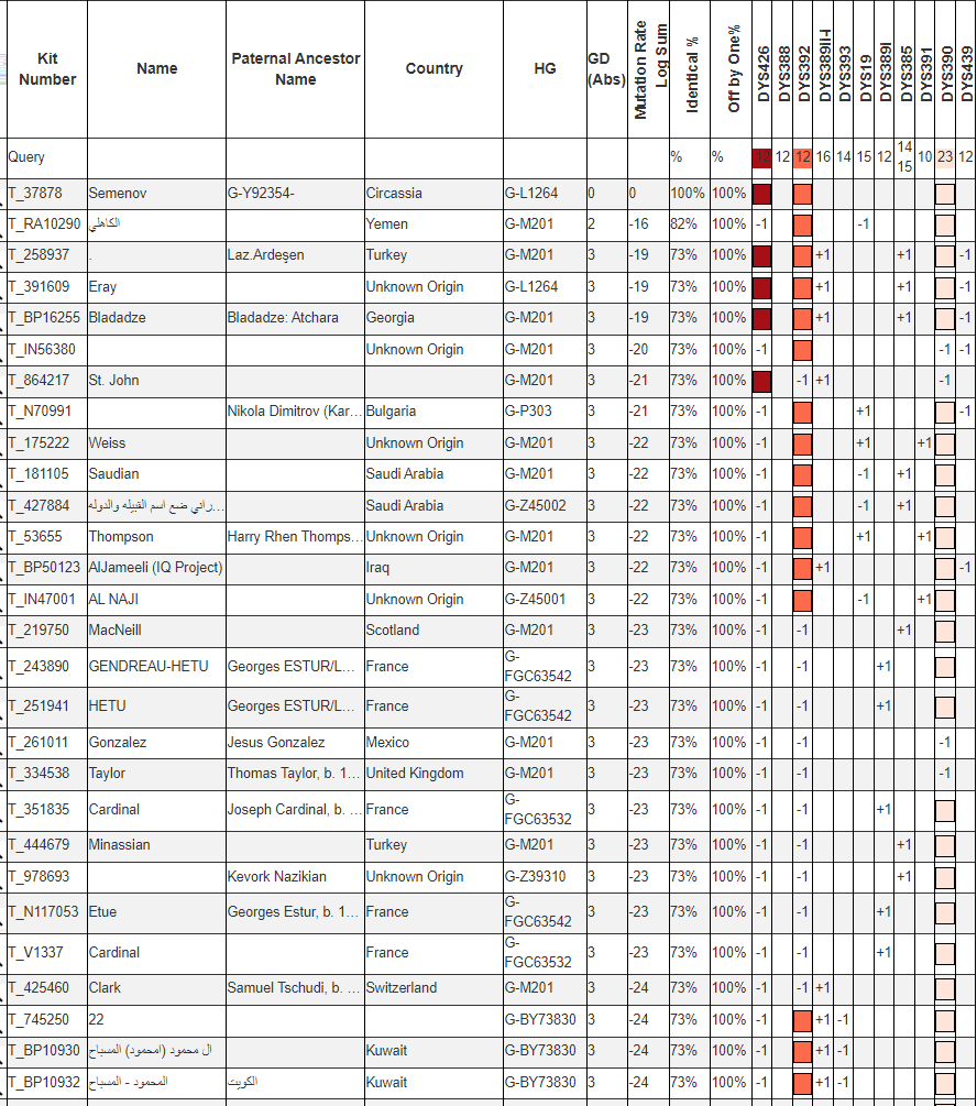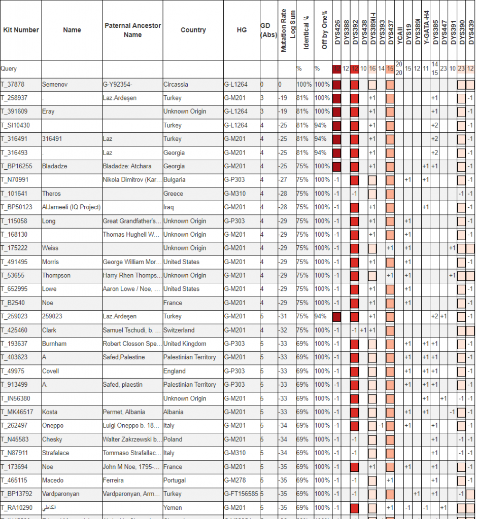 DYS426 = 12 и DYS392 = 12 редкое сочетание. Встречается оно у целого кластера лазского. Вероятне всего Семенов будет ближе им, на дистанции 1,5 — 3 тыс. лет.