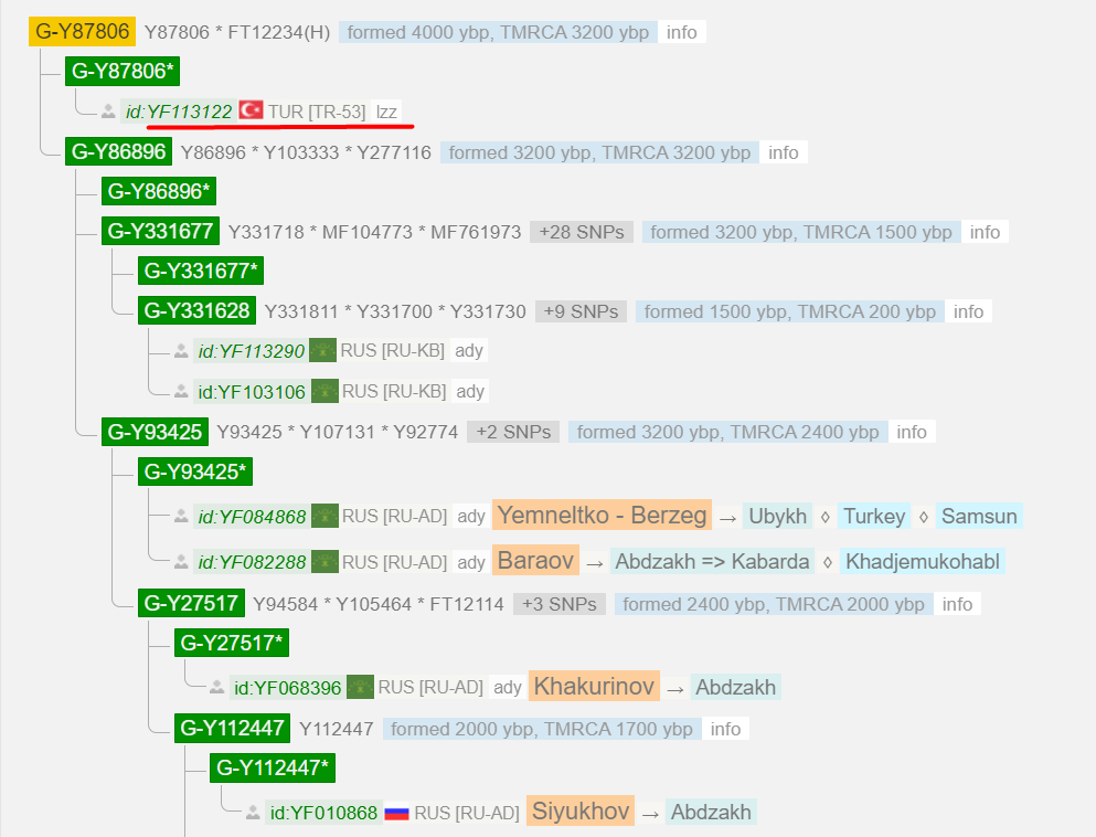 Сразу несколько лазов (не древе Yfull только один) находятся на дистанции ~3200 лет к большой группе адыгских результатов. При углублении теста Семенова можно будет узнать, дистанцию между ними.