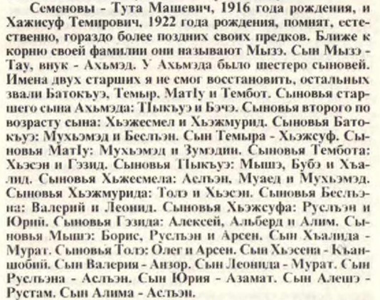 В книге Мусукаева А.И. «Века родословий» приводится родословная кабардинский Семеновых без упоминания села.