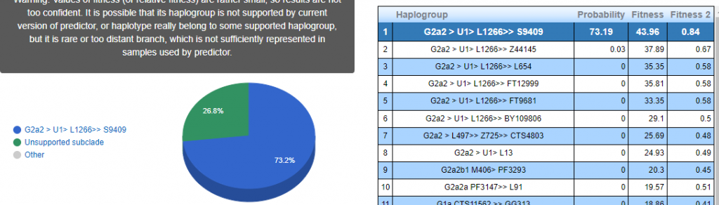 Выявлена гаплогруппа G2a2. Субклад G-L1264 >> S9409 >> BY53833