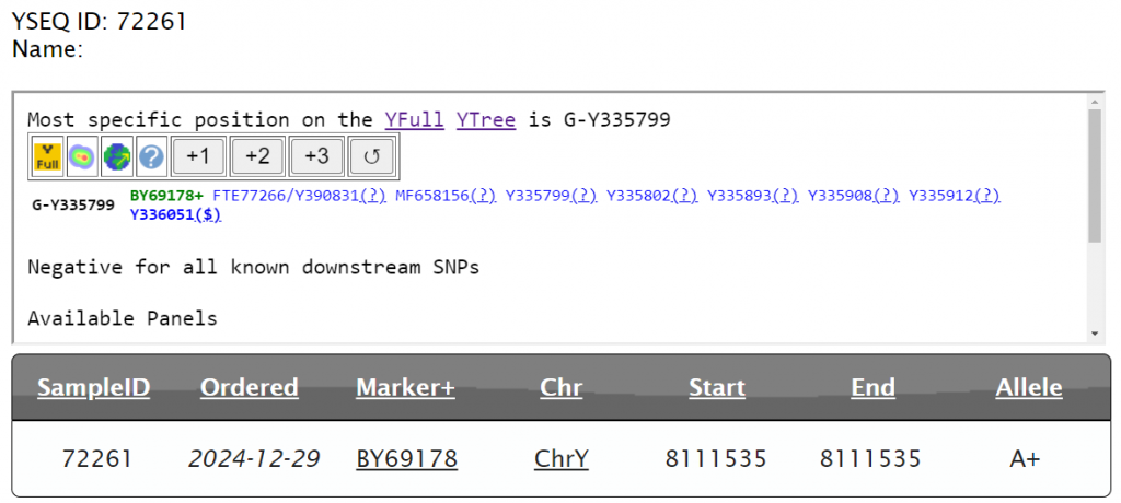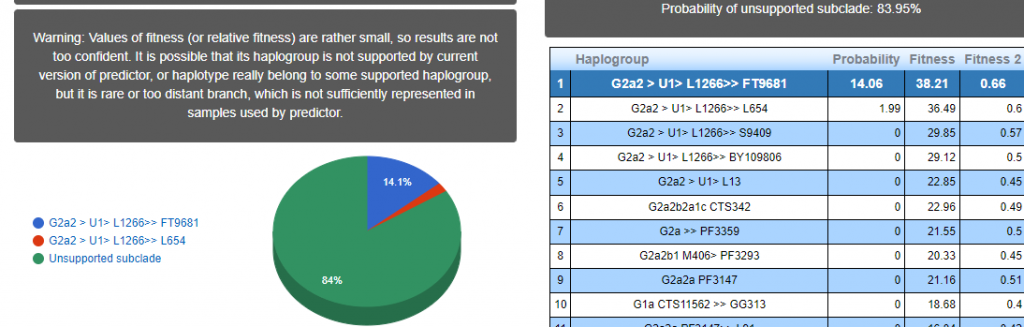Выявлена гаплогруппа G2a2. Субклад G-L1264 >> Y32924 >> Y272123 > Y335799