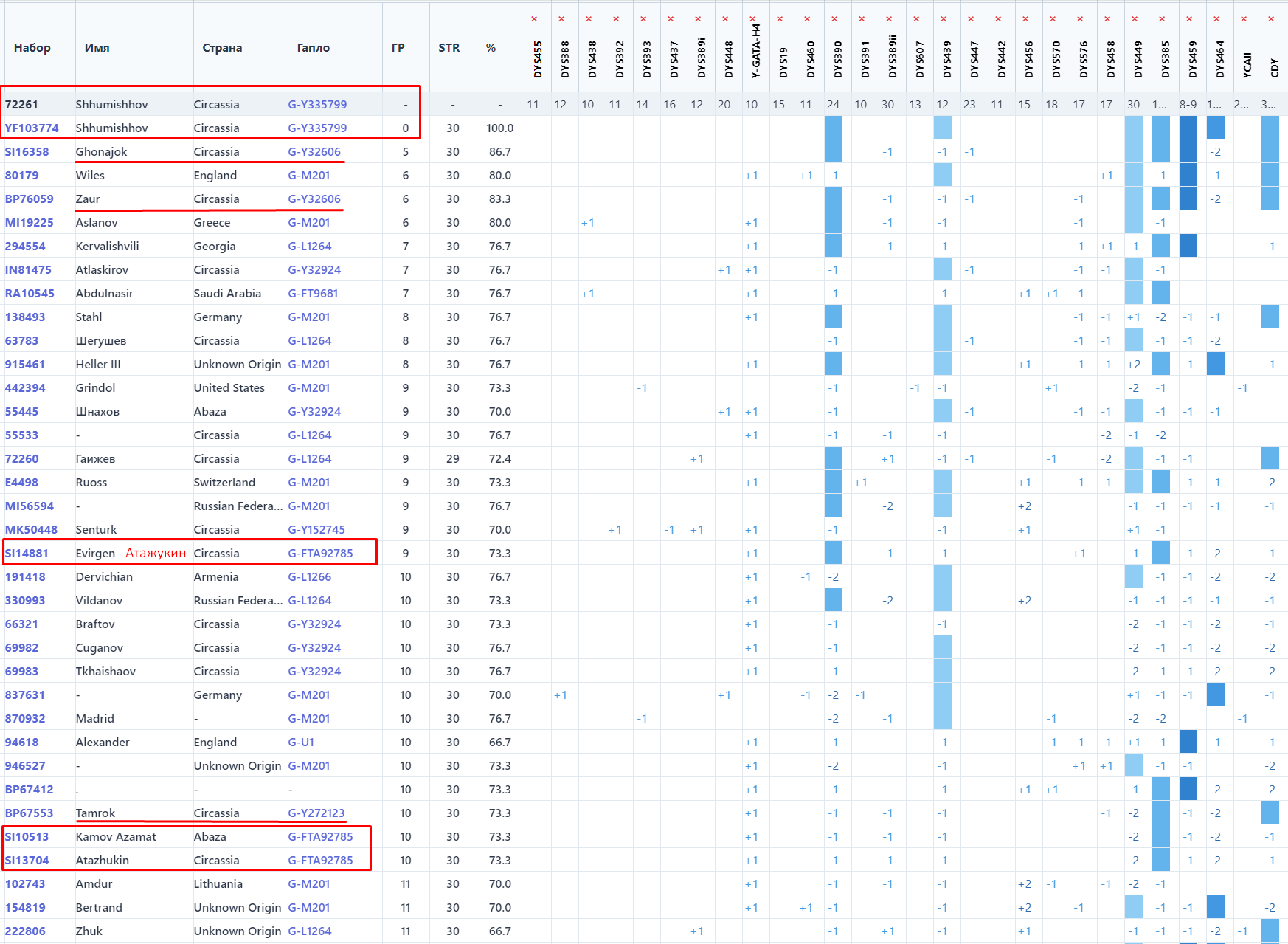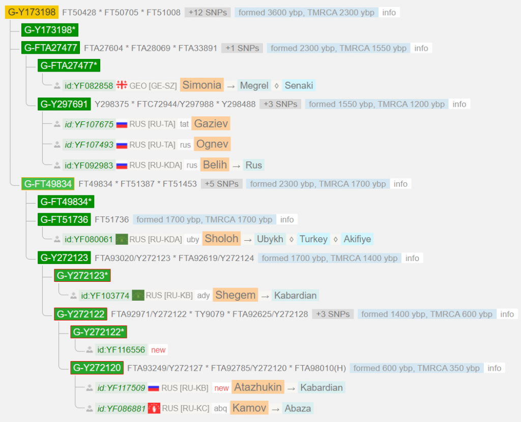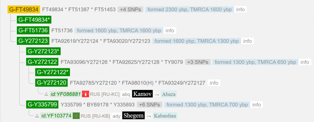 По результатам теста выявлена самая распространенная у адыгов линия G2a2 L1264. За тысячи лет потомки прародителя этого субклада разделились на множество ветвей. Истоки всех эти субкладов идут к древним земледельцам появившимся на Кавказе 7-10 тыс. лет назад.