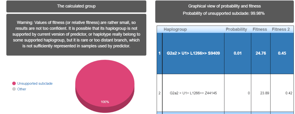 Выявлена гаплогруппа G2a2. Наиболее вероятный субклад G-L1264 >> Z44222 >> Y86896 >> Y331677