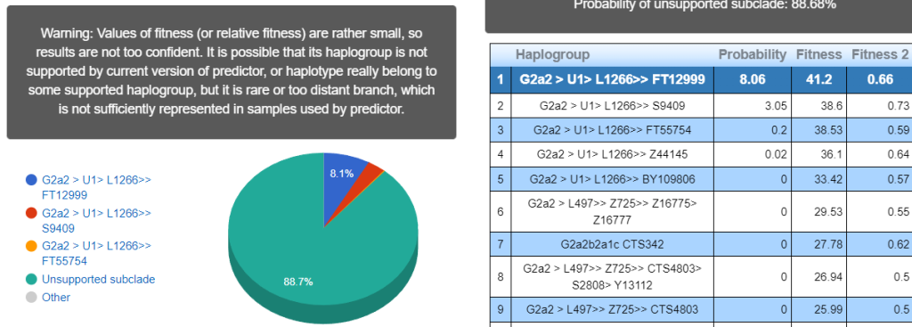 Выявлена гаплогруппа G2a2. Наиболее вероятный субклад G-L1264 >> Y32924