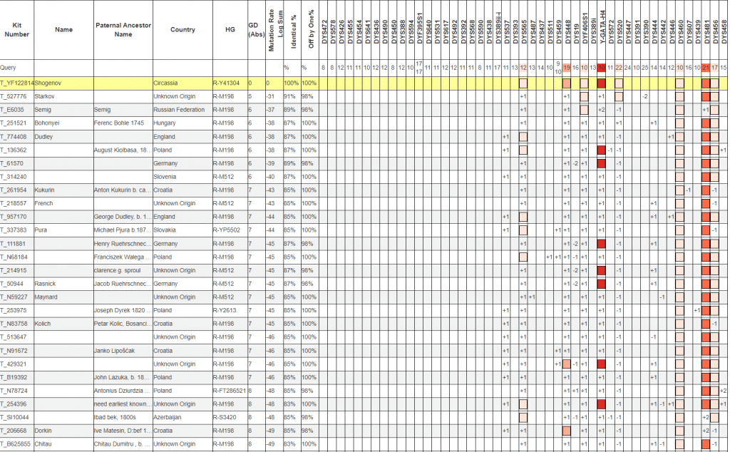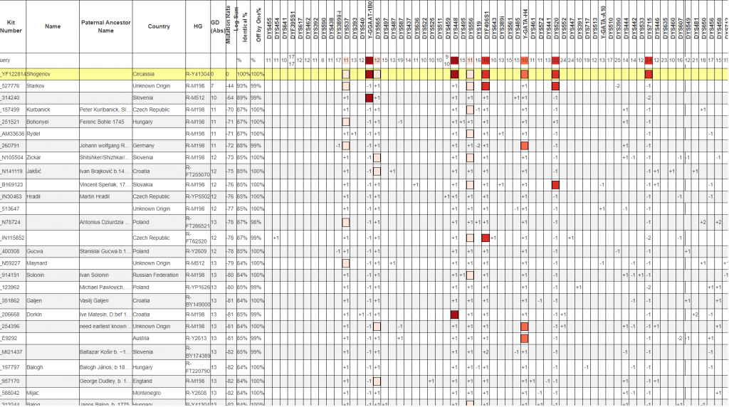 Результат тестирования Шогенова попадает в редкую ветвь международного генетического древа Yfull, в которой на расстоянии около 1800 лет до общего предка представлен палеоднк, найденный в захоронении династии Арпадов в Венгрии. Предположительно это представитель сербской/хорватской династии Шубич.